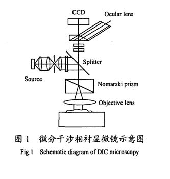 ![]() ![]() 由圖可知:由光源發(fā)出的光波經(jīng)起偏器后經(jīng)半透半反鏡入射至Nomarski偏振棱鏡,棱鏡將其分成兩束具有微小夾角、振動(dòng)方向相互垂直且振幅相等的線(xiàn)偏振光,通過(guò)筒長(zhǎng)無(wú)限顯微物鏡后,產(chǎn)生剪切量為△x(略小于顯微鏡分辨率)的平行光入射到放置在載物臺(tái)上的被測(cè)表面,從被測(cè)表面反射的兩束正交偏振光各自經(jīng)原路返回,由棱鏡重新復(fù)合共線(xiàn),經(jīng)檢偏器后成像在像面上。由于被剪切的光束產(chǎn)生的分離量略小于顯微鏡的分辯極限,因而在視場(chǎng)中看不到干涉條紋,通過(guò)將被測(cè)樣品的位相變化轉(zhuǎn)化為光強(qiáng)的變化,可看到具有立體感的浮雕成像。